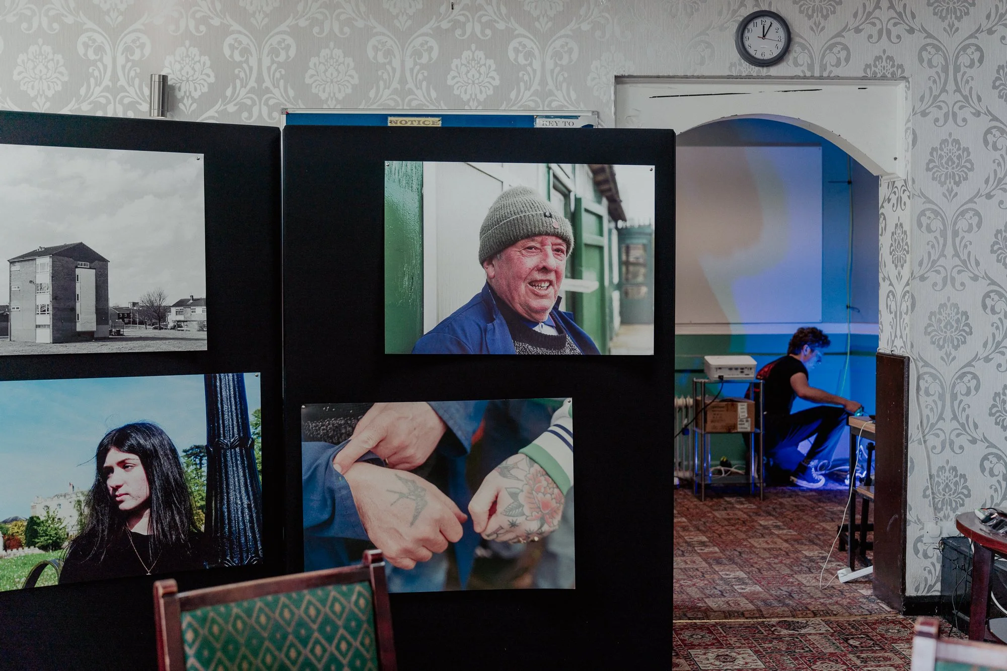 An indoor room displaying photographs on a black partition, with a person working at a table in the background. The photographs include a man with a beanie, a woman outdoors, and hands with tattoos swapping a card.