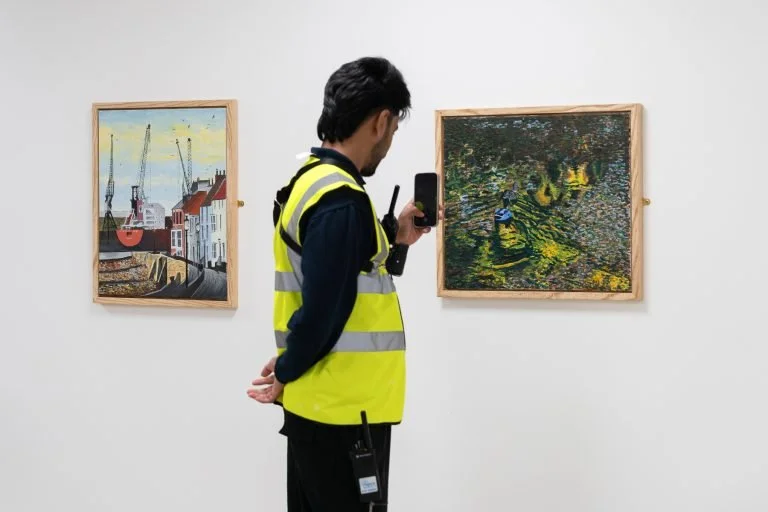 A man in a yellow safety vest takes a photo of two paintings on a white gallery wall, one depicting a harbor scene with cranes and ships, and the other a landscape of a wooded area with a small car.
